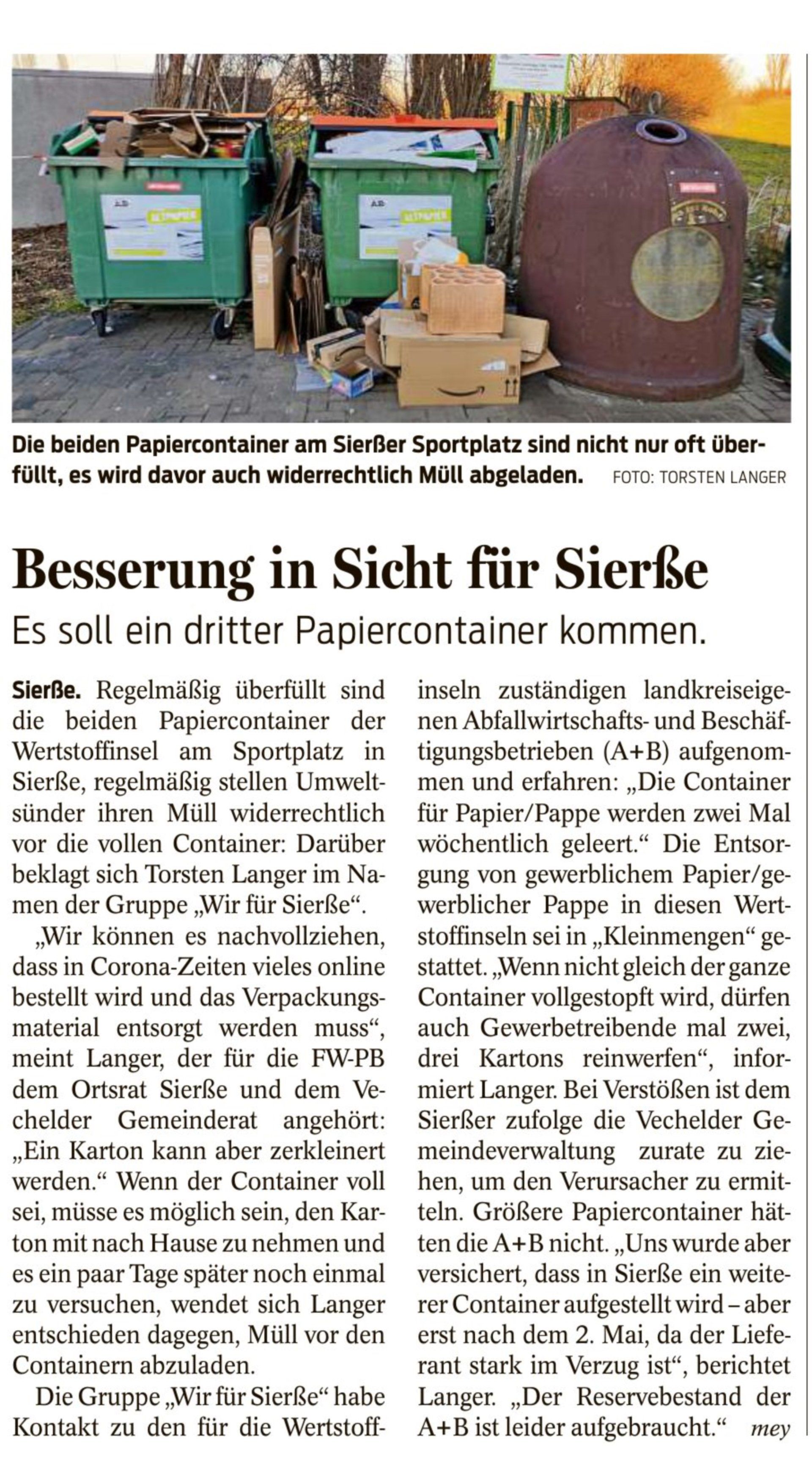 Wertstoffinseln ständig vermüllt - dritter Papiercontainer kommt im Mai !