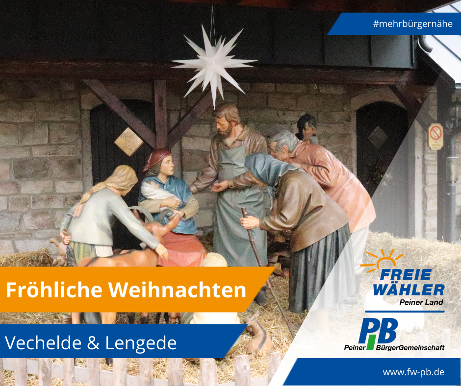 Die Stadtratsfraktion und Kreistagsfraktion der Peiner Bürgergemeinschaft wünscht Ihnen allen eine Frohe Weihnacht und einen Guten Rutsch in 2025. Für das kommende Jahr wünschen wir allen Bürgern unserer geliebten Fuhstadt und des Landkreises Gesundheit & Glück. Mit freundlichen Grüßen Anja Belte, Karl-Heinrich Belte und Marc Weidlich Peiner Bürgergemeinschaft (PB) Politik für die Stadt Peine und im Peiner Land