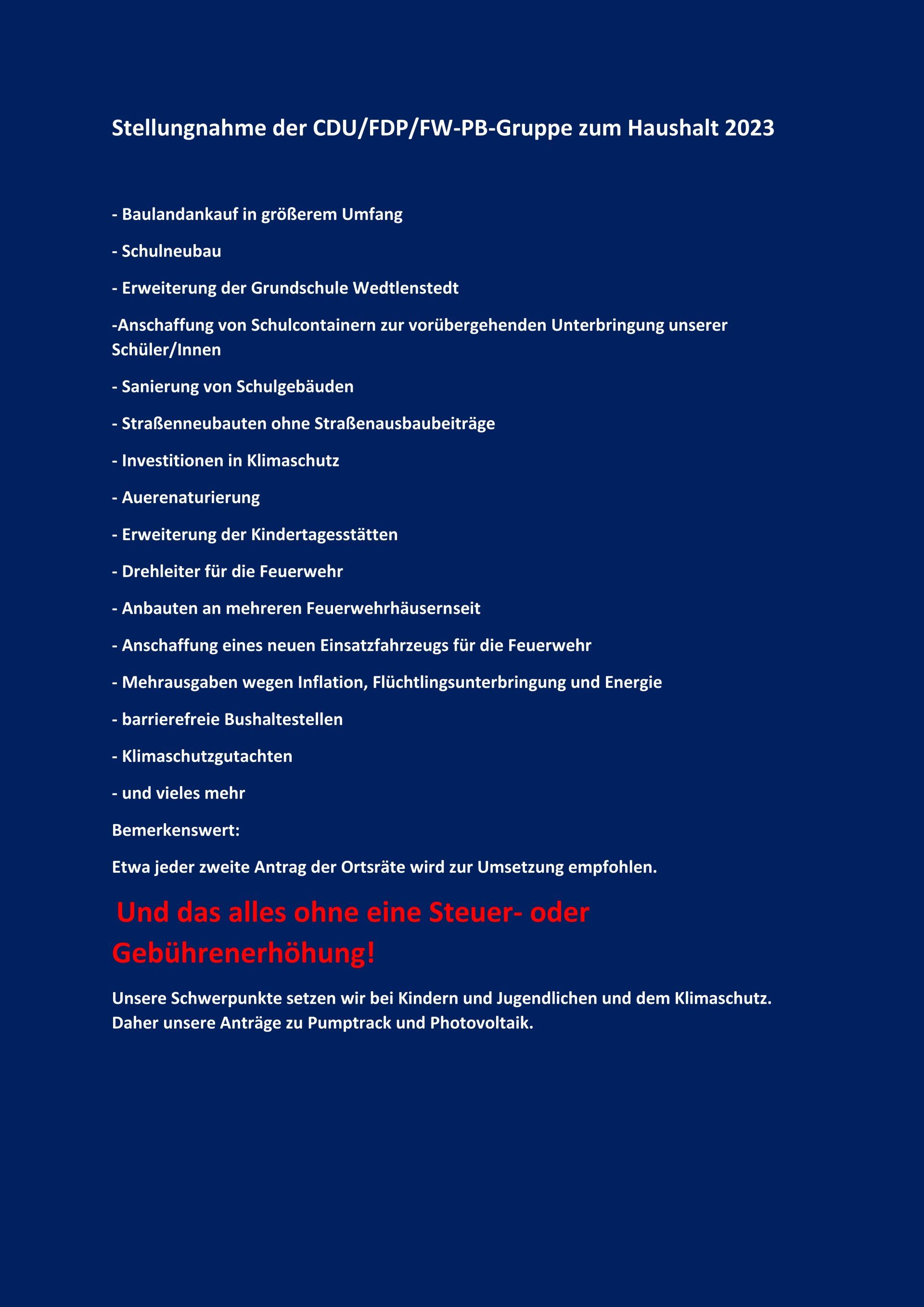 Ich finde es hervorragend, dass der Haushaltsentwurf 2023 ohne Erhöhung der Grundsteuern und Gebühren ausgeglichen ist. Sicherlich wird es die Bürgerinnen und Bürger aus der Gemeinde Vechelde freuen.
